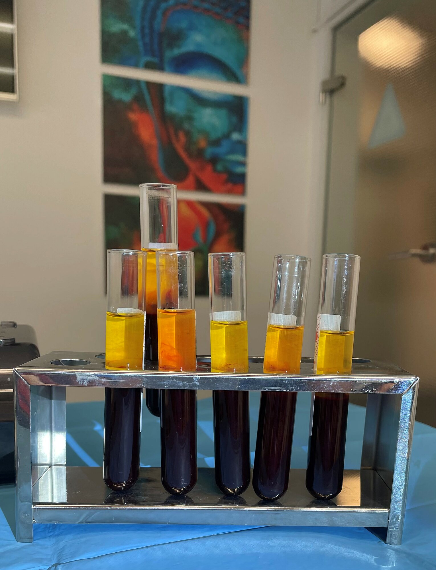 Um die Heilung dieser Wunden zu beschleunigen, führen wir die Eigenbluttherapie durch. Dabei wird Ihnen zunächst eine geringe Menge Blut abgenommen. Anschließend werden mit einer speziellen Zentrifuge die verschiedenen Blutbestandteile voneinander separiert.